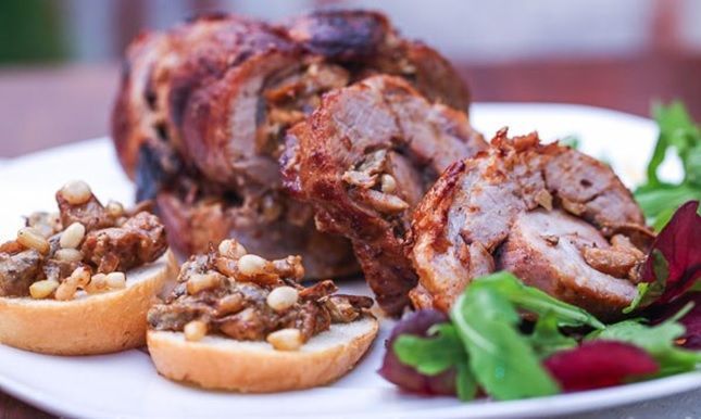 Подаємо до столу нарізаними шматочками, попередньо прикрасивши свіжою зеленню та кедровими горішками.